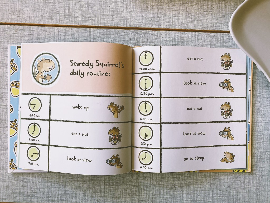 A friend sent us this book, Scaredy Squirrel, for Eloise. It’s not only a delight, but I had to laugh at this page because it so well represents our life right now.