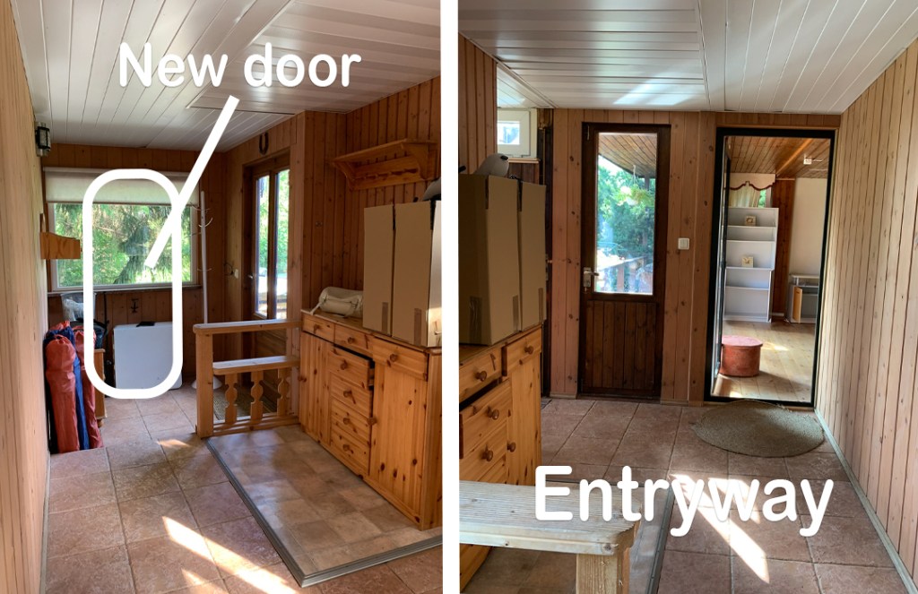 One of those strange, not very usable spaces of our house I mentioned earlier is our entrance and talveaed (winter garden). The area is unheated, has 6 different flooring materials with varying heights, absolutely no exterior insulation to keep out the cold, leaking ceiling, crumbling floor, and, underneath, a large portion has no foundation. (We just remove the rotting floorboards and replace them with new plywood every few years.) The winter garden had exposed dirt and floor to ceiling windows on three sides. So, during the summer, the entire area is a sauna. But during the winter, it’s a freezer (sometimes we literally put our extra food out in the entranceway when we didn’t have enough freezer space).
